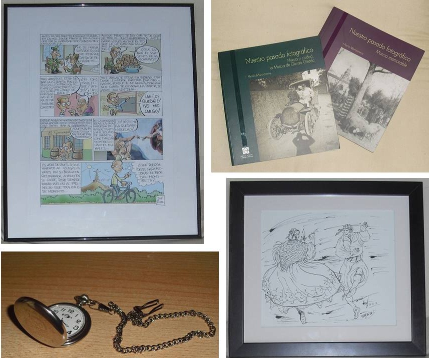 dos libros de fotografía antigua y un reloj de bolsillo grabado.
